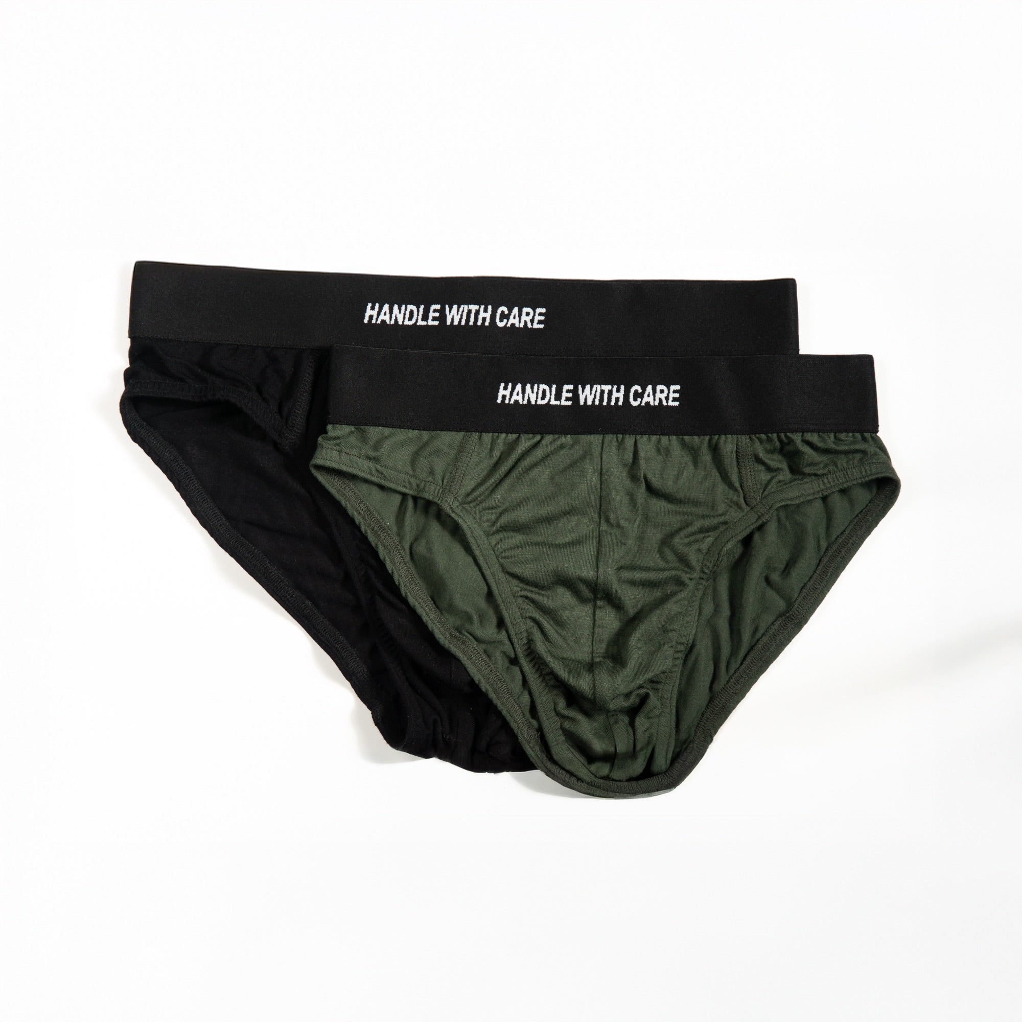 Black men's underwear with 'HANDLE WITH CARE' text on a plain background